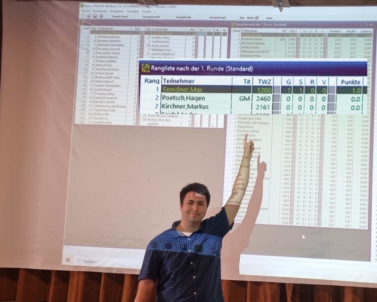 Turnierimpressionen: Vom letzten Jahr Erste Runde Ein schöner Turniersaal Wer liegt vorne? Zweite Runde Fünfte Runde Da wackelt der Sieg Schöner Springer Tomi, denk nach! Und wer hat gewonnen?